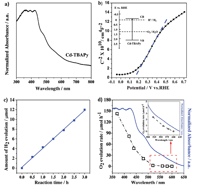 a)Cd-TBAPy的紫外-可见散射谱;b)Cd-TBAPy的Mott-Schottky图谱以及计算的Cd-TBAPy导带边位置,电解液为0.5M的磷酸缓冲液,PH=7.0;c)负载质量百分比为3.5%的Pt作为助催化剂的Cd-TBAPy的产氢曲线;d)负载质量百分比为0.4%的CoPi作为助催化剂的Cd-TBAPy的紫外-可见漫散射谱(蓝线)以及产氧速率与波长的依赖关系曲线(黑线)。产氢反应条件:90mL的乙腈(CH3CN)、2mL的水与10mL的三乙醇胺(TEOA)混合液作为牺牲剂;产氧反应条件:100mL 1×10-3M AgNO3溶液,催化剂50mg,氙灯功率300W,波长≥420nm。
