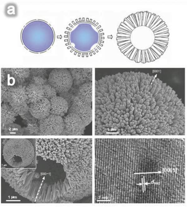 f)通过将纳米棒取向连接到中心茎中并随后模板化生长和形成最终空心球的囊状模板自组装过程形成的ZnO多脚状单元的晶体取向;
