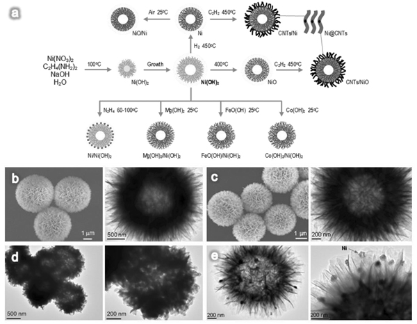 b-e)b)β-Ni(OH)2,c)NiO,d)金属Ni,和e)Ni/β-NiNi(OH)2中空结构的SEM和TEM图像。