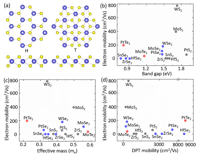二维金属硫属化物由于其在晶体管、光电探测器以及光电化学能量转换等方面的潜在应用引起了科研工作者的广泛关注。这些材料通常只有几个原子层的厚度,因此可通过电磁场以及光的作用,有效调节其材料内部的电荷传输。然而,单层的二维金属硫属化物往往具有较低的载流子迁移率并且在不同实验条件下测量结果不尽相同,且通常在室温下小于300 cm2V-1s-1。作为对比,硅和砷化镓在室温下其电子迁移率约为1400和8500 cm2V-1s-1 。这个显著的差距极大的限制了二维金属硫属化物作为高迁移率半导体组件的应用,因此,充分理解迁移率限制因素以及找到较高迁移率二维半导体材料极其重要。