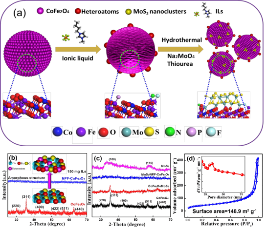- a) 催化剂合成示意图, b-c)XRD图, d)吸脱附等温线及孔隙大小分布。