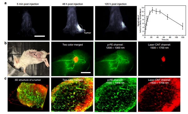 戴宏杰在成像领域的研究主要为利用碳纳米管的红外波长荧光显示动物器官成像。戴宏杰团队早在2008年就将碳纳米管载药应用在肿瘤治疗中,又在2011年将成像功能加入。因而在载药的同时,实现药物的追踪。课题组利用碳纳米管1000到1400纳米的波长成像,改波段的波长具有较小的散射,可以在小鼠体内获得清晰的成像结果。相对于传统的CT成像和X光成像,碳纳米管的红外成像对生物体的辐射更小,且成本更低。