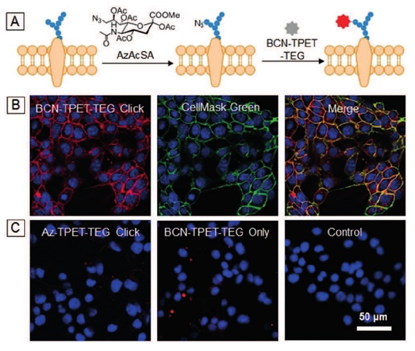 刘斌团队最近报导了一种基于聚集诱导发光的荧光“点亮”探针,BCN-TPET-TEG,以生物正交的方式实现生物体内肿瘤标记。BCN-TPET-TEG由AIE光敏剂、无铜点击的环辛炔和亲水三甘醇链组成。这个探针具有在可见光区较宽的吸收光谱,近红外发射和ROS产率高达59.1%的优点。由于三甘醇链的亲水性及AIE荧光分子的发光特性,BCN-TPET-TEG在水中发光较弱。但是当其与通过细胞代谢引入肿瘤细胞表面的叠氮基团反应后,探针的荧光增强,可实现快速的肿瘤特异性成像,和实现肿瘤光动力治疗。