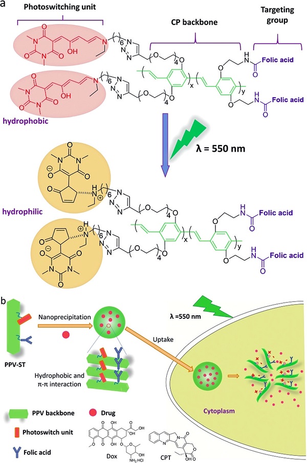 王树团队最近报导了一种光响应的共轭聚合物载体,用于药物传递和成像。在这个工作中,作者在PPV骨架上接入了光响应基团DASA。DASA可在光照下实现亲疏水性的变化,从而实现纳米粒子的溶胀和药物释放。又由于DASA与PPV骨架之间的荧光共振能量转移,在这个过程中实现荧光的变化。