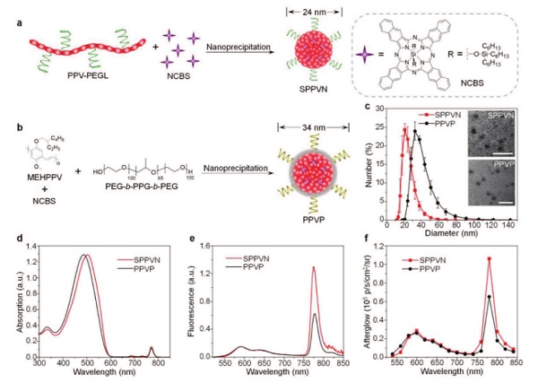 浦侃裔团队近期报导了一种亲水性的PPV衍生物,可以在生物介质中自组装形成纳米粒子(SPPVN)和近红外余辉发光。此材料在可在小鼠体内实现转移肿瘤成像。相对于从疏水PPV衍生物制备得到的纳米粒子(PPVP),SPPVN拥有较小的粒径、更高的能量转移效率和更强的发光强度。除此之外,因为SPPVN比PPVP-聚乙烯醇具有更高的PEG密度,SPPVN可以在肿瘤中更好地积聚。这些优点使得SPPVN可在肿瘤成像中具有非常好的应用前景。