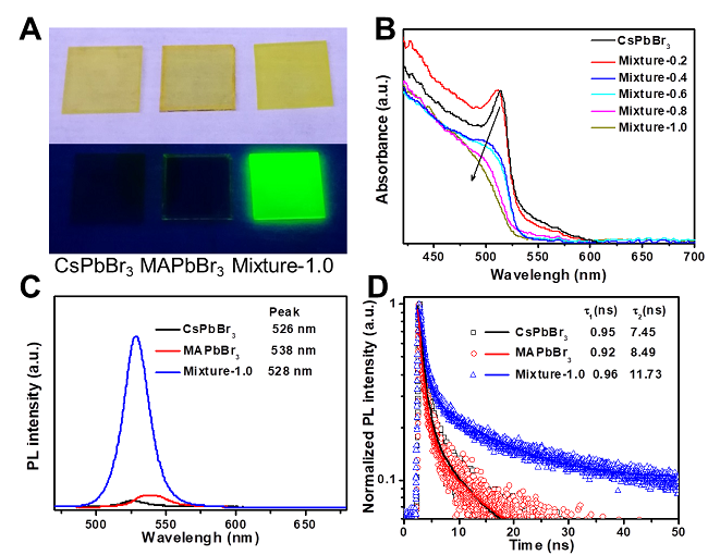 (A) CsPbBr3、MAPbBr3、混合钙钛矿1.0在日光灯和紫外灯下的图片; (B) CsPbBr3和不同混合比例的钙钛矿的紫外可见吸收曲线; (C) CsPbBr3、MAPbBr3、混合钙钛矿1.0的PL曲线(激发波长400nm,4uw) (D) CsPbBr3、MAPbBr3、混合钙钛矿1.0的荧光寿命曲线。