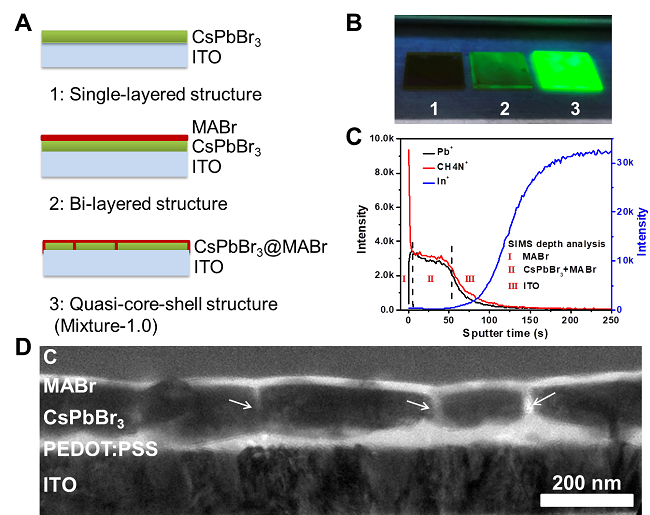 不同组分分布示意图: 单层 CsPbBr3、 叠层CsPbBr3/MABr 和CsPbBr3@MABr核壳结构; (B) 不同钙钛矿在紫外灯下的PL图片; (C) 二次离子质谱(SIMS)深层分析 CsPbBr3@MABr核壳结构; (D) 聚焦离子束(FIB)切割,表面溅射C作为保护层的CsPbBr3@MABr壳核结构TEM截面图(图中白色部分表明有MABr壳状结构包裹CsPbBr3晶粒)。
