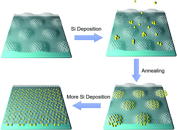 图1. 在石墨烯/Ru(0001)界面处的硅烯结构形成示意图
