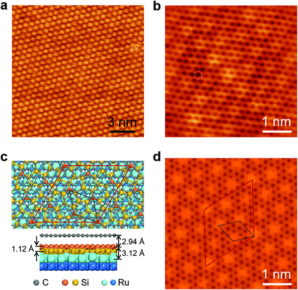 (a)封装在石墨烯和Ru(0001)之间的单层硅烯的STM图像。(b)为完整碳原子晶格的原子分辨率图像。(c)(7×7)Ru(0001)/(√21×√21)硅烯/(8×8)石墨烯构型的弛豫原子模型的顶视图和侧视图(超晶格元胞由红色菱形标记)。(d)(c)中构型的第一性原理模拟STM图像。