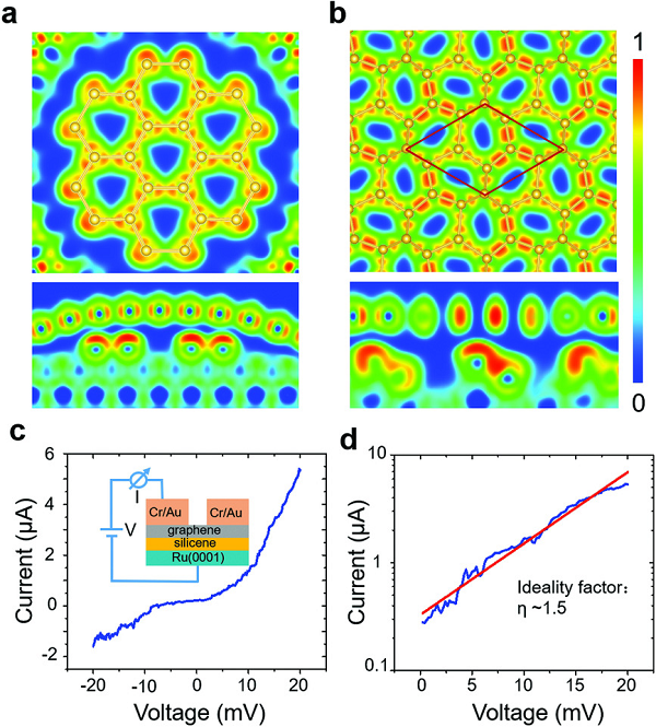 (a,b)硅原子平面上的硅烯纳米片和单层的ELF图。c)在105 K下测量的石墨烯/硅烯/钌垂直异质结构的电流-电压曲线,显示典型的肖特基样整流行为。插图是样品结构和测量的示意图。 d)伏安曲线的对数图。通过将其与Schockley模型拟合,可以得到 ~1.5的理想因子。