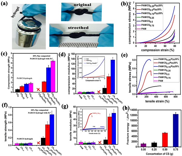 本研究设计了一种新型的基于生物高分子模板的方法来制备由CS和PPy组成的超强、导电、生物相容好的水凝胶。壳聚糖分子框架在亲水性水凝胶基质中充当疏水性PPy纳米棒的聚合模板,使得PPy纳米棒均匀分布在PAM / CS IPN水凝胶中,从而形成导电通路以赋予水凝胶优良导电性。 这种由生物高分子模板控制的原位合成PPy纳米棒的新策略,克服了疏水性导电聚合物难以均匀掺入亲水性水凝胶中形成贯通导电网络的难题,为导电水凝胶制备的提供新的设计思路。