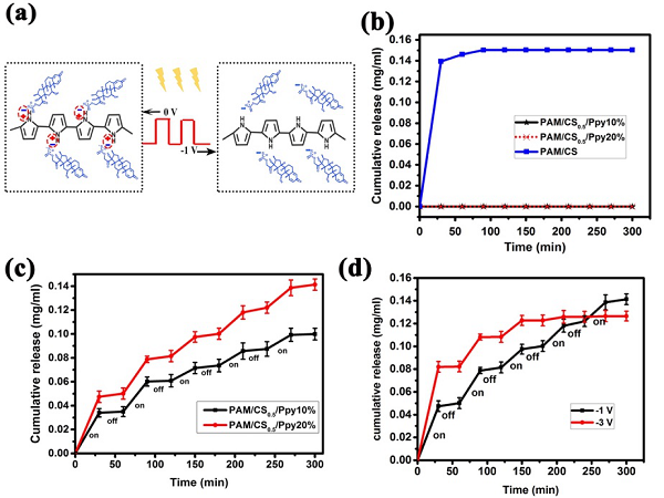 图4(a)导电水凝胶对地塞米松(DEX)负载和释放示意图。 当施加负电位时,通过氧化还原过程释放药物。 b)在没有电刺激的情况下,DEX从PAM / CS水凝胶中释放出来,而在PPy-PAM / CS水凝胶不释放出DEX。 (c)在电刺激下,DEX从具有不同PPy含量的水凝胶中释放。 (d)在不同电压的电刺激下,DEX从20%PPy-PAM / CS水凝胶中释放。