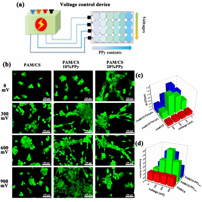 a)高通量电刺激C2C12细胞示意图;b-d)不同刺激电压下,不同PPy含量对C2C12在水凝胶上增殖行为和形貌的影响。