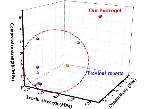 图7与现有导电复合水凝胶相比该水凝胶具有较强的机械性能和良好的导电性