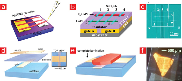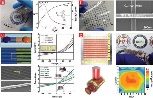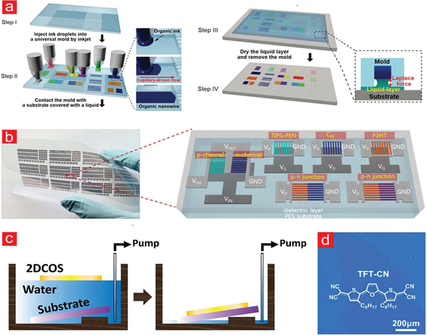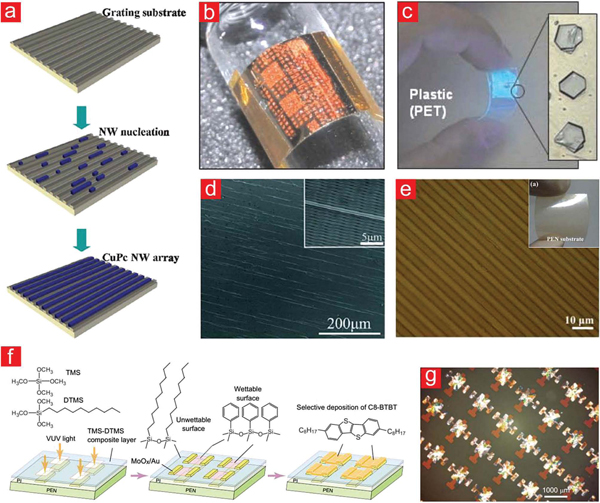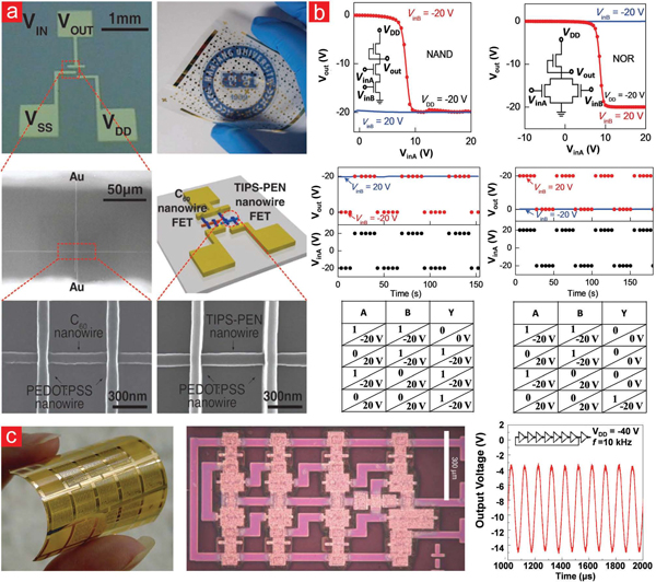 (b)塑料基板上的各种功能性有机纳米图案的大规模集成电路,由FET,反相器和由单晶有机纳米线制成的p-n二极管阵列组成的集成电子器件。