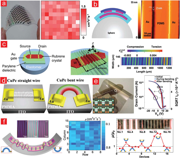 (f)共形有机TIPS-并五苯单晶FET阵列和器件阵列在不同弯曲应变下的迁移率变化。