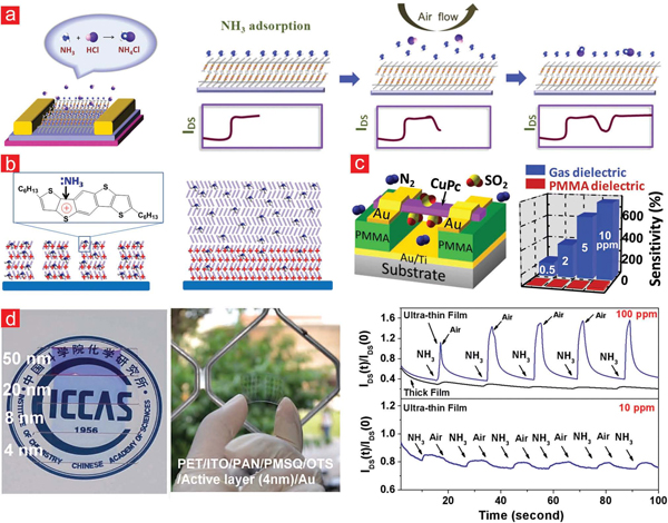 (c)基于OFET的传感器的示意图,其具有气体介电质以及气体介电质和PMMA介电质器件的灵敏度比较。