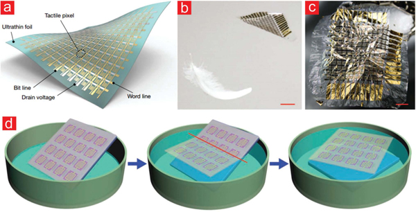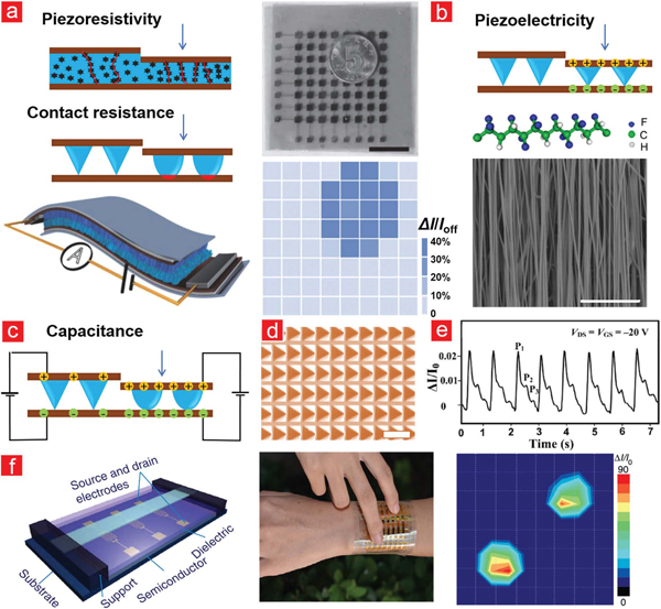 (f)SGOTFT的器件几何结构的示意图和8×8阵列的压力感应映射到微妙的触摸。