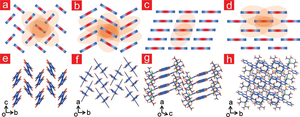 (a-d)有机半导体晶体中典型分子堆积基序的示意图。相邻分子之间的跳跃二聚体用红色圆圈标记。