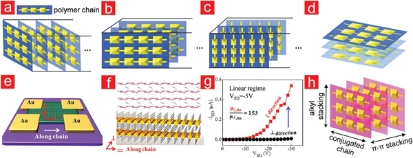 (e)具有基于单个纳米片poly-PCDA晶体的四个交叉电极的晶体管结构的示意图;在这种装置中,平行于和垂直于聚合物链的电荷传输,可以测量聚合物晶体中的链内和链间电荷传输。