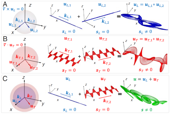 图1. 任意矢量波中的几何与自旋。对于纵波和横波,它们的极化与波矢的强依赖关系反映了其潜在的自旋轨道耦合关系。