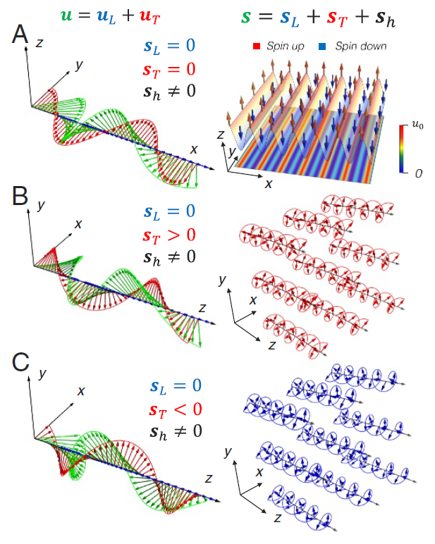 近日,同济大学物理科学与工程学院声子学与热能科学中心发表了关于固体材料弹性波自旋的最新研究成果,揭示了弹性波中的自旋本质属性。博士生龙洋为论文第一作者,青年千人任捷教授为论文通讯作者,陈鸿教授为论文合作者。160年前,赫尔曼·冯·亥姆霍兹发布了他著名的场分解定理,揭示了任意矢量场一定可以分解成无散的横波场和无旋的纵波场。然而,过去一直以来,人们认为只有电磁波或类似电磁波的弹性横波才能拥有自旋;而对于弹性纵波声学纵波,其并不具备携带自旋角动量的能力。而在这项工作中,同济声子中心的团队挑战并刷新了人们对于弹性波自旋的认识,证明了弹性纵波能够携带自旋角动量。同时,更重要地,这里还存在一种新的自旋角动量形式,即纵波横波杂化产生的杂化自旋角动量。因此弹性波的自旋,不仅含有来自纵波(位移场uL)和横波(位移场uT)各自的自旋,还要考虑来自两者杂化耦合产生的自旋贡献。换句话说,弹性波自旋可以从物理上拆分为三部分: