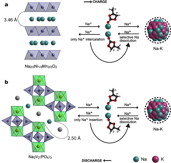 提出了该发展方向后,Goodenough课题组在Journal of the American Chemical Society上发表了题为Cathode Dependence of Liquid-Alloy Na-K Anodes的文章,他们利用液态合金负极有效解决了电极-电解质界面的不相容问题和枝晶生长的问题。同时可以利用液体的流动性和自愈性实现无枝晶的负极界面。他们指出在室温下熔融的Na-K合金与碱性离子电池的可燃液态碳酸盐电解质不混溶,合金可以固定在其润湿的多孔膜中。因此,他们的研究提供了一种在室温下用易燃液体电解质在合金中镀树枝状无钠或钾的方法,为可充电电池提供了安全保障。