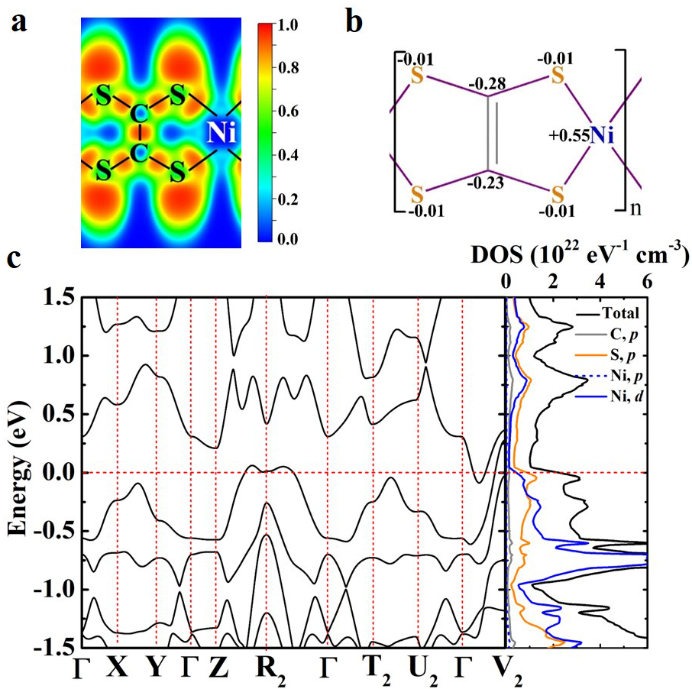 (a)poly(Ni-C2S4)电子局域方程图。(b)poly(Ni-C2S4)原子电荷图。(c)poly(Ni-C2S4)能带结构和投影态密度。