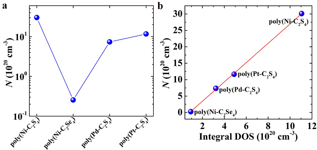 (a)室温下,poly(Ni-C2S4), poly(Ni-C2Se4),poly(Pd-C2S4)和poly(Pt-C2S4)本征载流子浓度(N)。(b)poly(Ni-C2S4), poly(Ni-C2Se4),poly(Pd-C2S4)和poly(Pt-C2S4)本征载流子浓度(N)和积分态密度的关系。