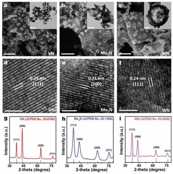 (a-c)VN、Mo2N和WN的SEM图像(插图:相应的低倍TEM图像);