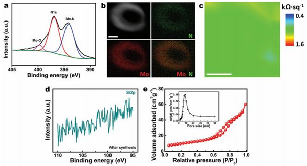 (b)Mo2N孔隙结构的SEM图像及其元素mapping图;