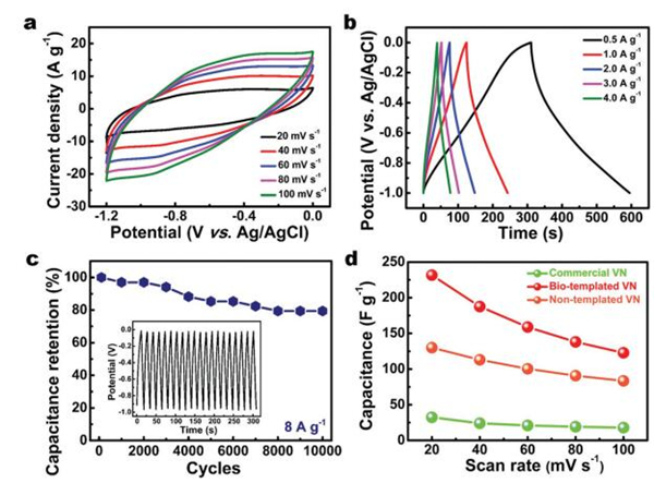 (d)不同扫描速率下,生物模板衍生的VN、非模板化VN和商用VN电极的比容量对比图。