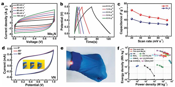(c)不同扫描速率下,Mo2N和VN电极SSC器件的电容图;