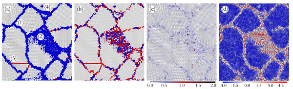 本工作将机器学习方法用于分析多晶体晶界处的原子结构重排。该方法直接将原子结构划分为罕见重排区和经常重排区。热涨落下原子重排的可能性与自由体积、势能有关联,但并不是可以完全归因于这些物理量。机器学习所得的量可以预测特定原子重排所需的能量势垒。晶界中发生重排的原子多数有着可能性更多的重排轨迹,而非像块状非晶体那样大幅降低能垒。该工作表明多晶体塑性可以通过局域原子结构环境来研究,而不需要传统的显微结构分类。