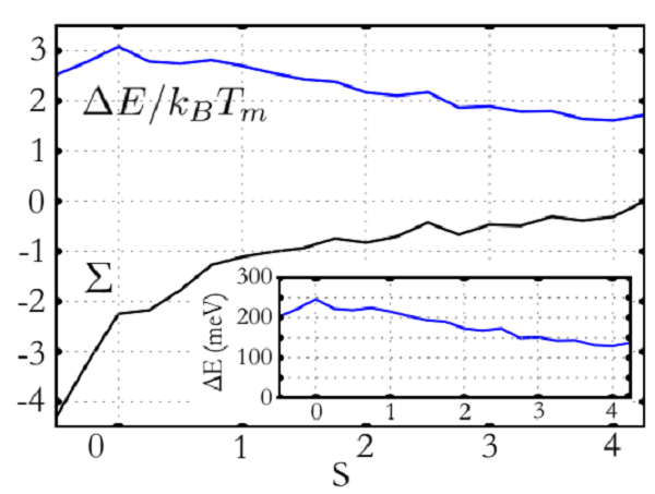 图4:熔点温度处,用热能标度的能垒和重排可能性中提取的与软度的关系。