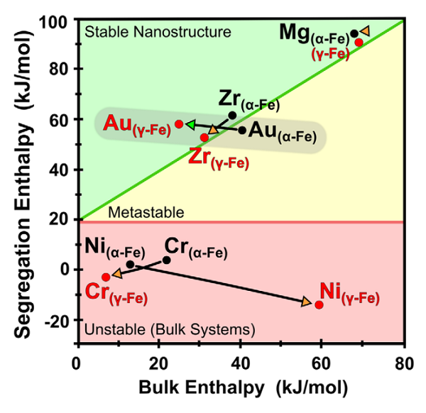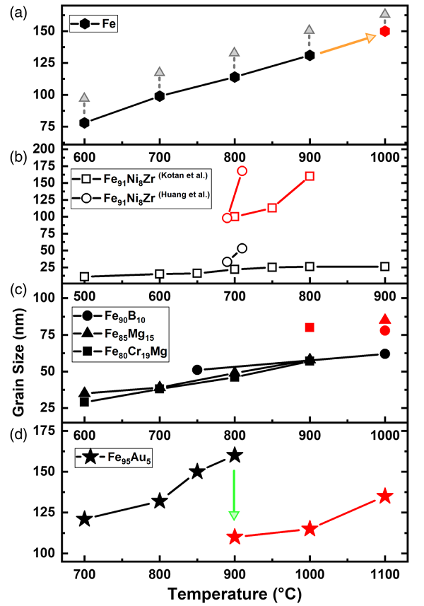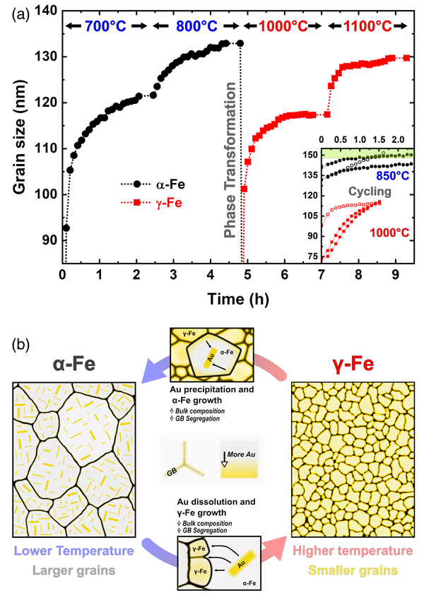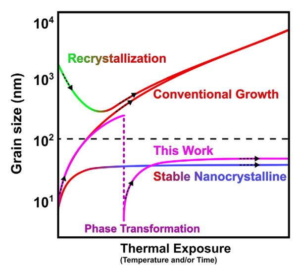 纳米晶Fe-Au合金的反直觉行为回避了晶粒生长的常规范式:通过将再结晶类似的事件(相转变)和稳定纳米晶合金设计标准相结合,可在高温下得到一个更低且稳定的晶粒大小。相转变使体系焕然一新,得到新的平衡晶粒尺寸,比前述的确定溶质的低温相尺寸更小。作者证明这一行为可以循环多次,因此该方法通过晶界偏析提供了一个纳米晶热力学稳定性的临界测试。同时,还使得不同溶质的合金设计中部分或全部相稳定,从而可在较宽的温度范围内保持纳米晶相。这种合金可在较高温度下表现出优异的力学性能,可能优于低温下的性质。基于所观察的Fe-Au晶粒长大,可推知合金通过转变在高温下显著强化,通过在转变温度周围的循环处理,力学性能可以得到重复性切换。这是一项可应用于高温而不需要耐火材料的新方案。
