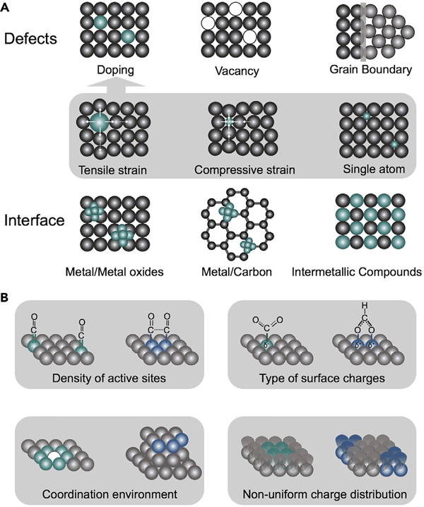 (B)缺陷和界面对催化剂表面的影响。活性位点的密度(左上):单原子分散(左)与团簇(右);表面电荷的类型(右上):带负电的部位(左)与带正电的部位(右);配位环境(左下):空位导致的不饱和配位(左)与结构导致的不饱和配位(右);非均匀电荷分布(右下):缺陷限域电荷分布(左)与界面处电荷分布。