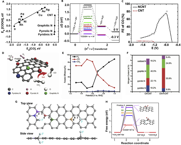 (B)在原始CNTs和NCNTs上计算CO2电还原至CO的自由能图。自由能图显示了在0 V vs. RHE时的最低能量路径,以及在-0.3 V vs. RHE时,反应路径释放能量。
