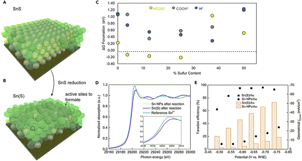 (B)SnSx的部分还原导致了Sn(S)膜的生成,促进ECR产生甲酸盐。 虚线圆圈表示生成甲酸盐的活性位点。