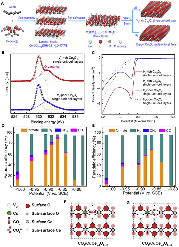 (F,G)吸附在Cu-CeO2上的CO2分子,其中(F)两个和(G)三个氧空位分别聚集在Cu位点周围。
