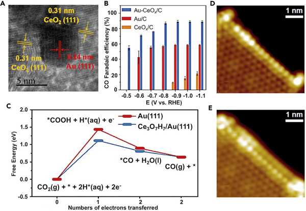 (B)在0.1M KHCO3溶液中的Au/C,CeOx/C和Au-CeOx/C催化剂上的CO的FE以及对应的施加电位。