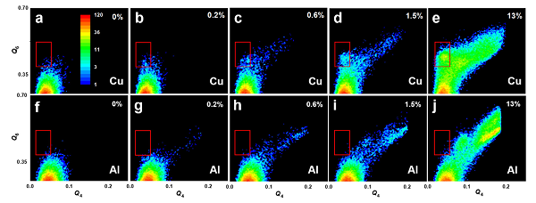 红色方框里的团簇表示bcc晶相。Cu的形核包含bcc晶相,而Al的形核不包含。右上角的百分比表示系统的结晶度。