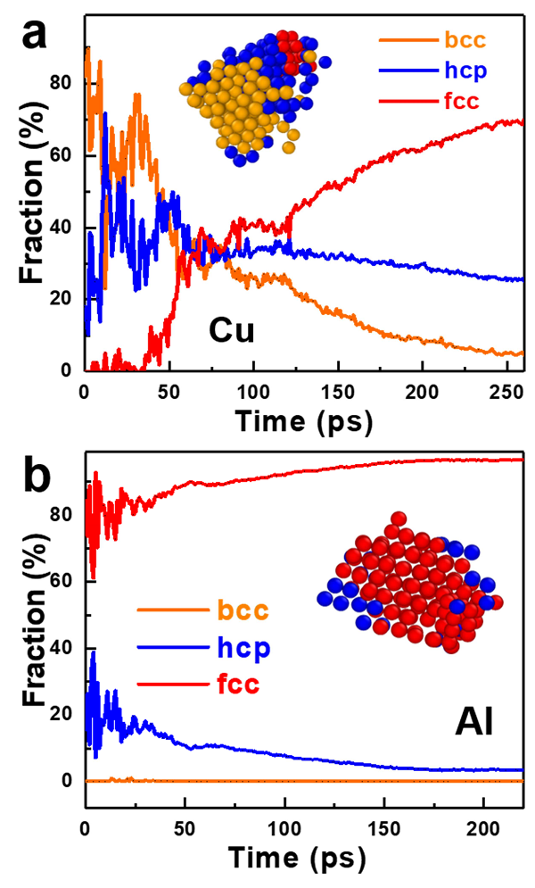 本工作通过分子动力学模拟,研究了不同压力下面心立方(fcc)金属铝和铜的结晶路径。基于晶格振动与声子散射分析,揭示了晶化过程中各晶相是否形成取决于其热力学稳定性,因而,我们可以通过对合金体系的自由能表面形貌进行编译,调节各晶相在自由能曲面上对应能谷的局域形貌(能谷深度等),来实现对晶化路径及多晶型选择的调控。对应于真实材料制备,我们可以通过合金元素添加、制备压力调节等方法,实现对第二相稳定性的调控,从而实现结晶过程中的选择性制备。此外,对晶化过程的研究,也将有助于更全面地理解合金体系的非晶化和玻璃转变的本质。