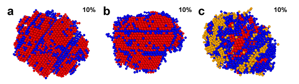 黄色、蓝色、红色小球分别表示bcc, hcp和fcc原子。