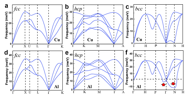 图5:常压下不同晶相结构的Cu和Al的晶格振动谱。