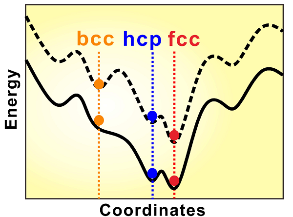 若没有bcc能谷(实线),过冷液体直接转变为hcp和fcc相。通过对自由能曲面进行重新编译,可以在晶化路径中实现bcc晶相的析出(点划线)。