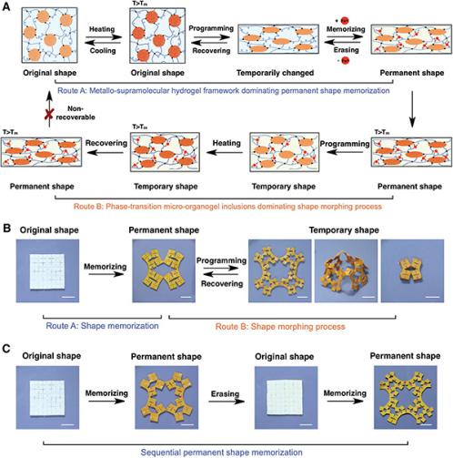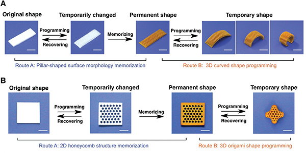 (A, B) 从永久的2D形态记忆到可恢复的临时3D形状编程的逐步形状改变过程;