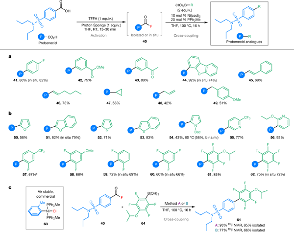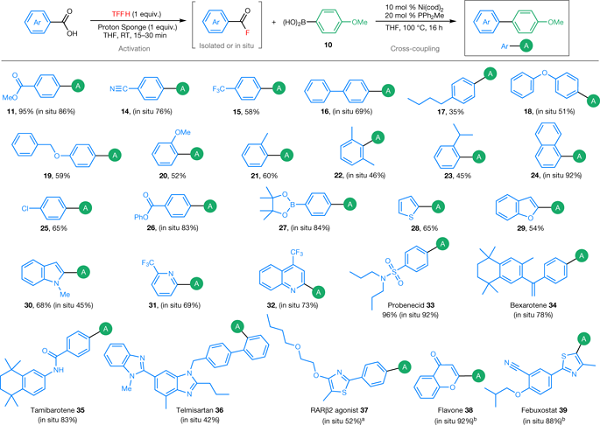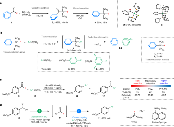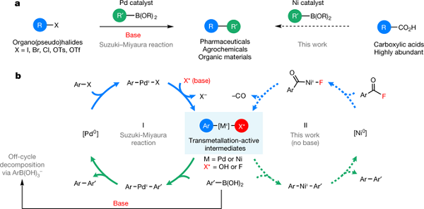 图2. 脱羰反应产生的金属交换活性氟化镍中间体的发现使得羧酸和芳基硼酸能够进行Suzuki–Miyaura反应