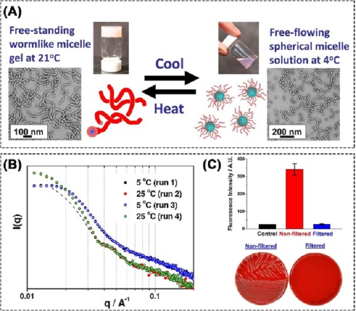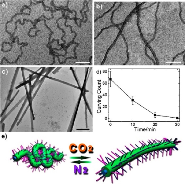 用二氧化碳连续刺激导致胶束由蜷曲蠕虫状逐渐伸展为刚性纳米线。