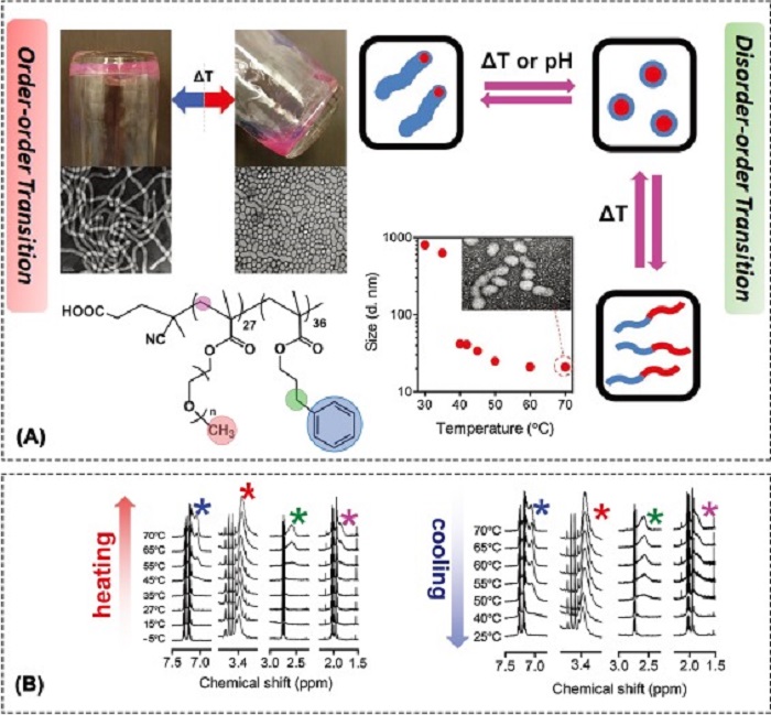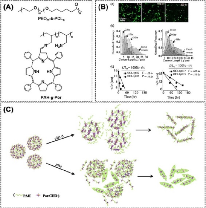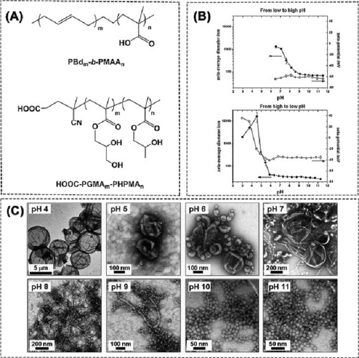 在过去十年中,由于PWLMs的多功能性和易于设计,研究人员在设计刺激响应性PWLMs方面取得了很大进展。可以引入刺激敏感单元,重建其组装模式,形成结构独特的两亲共聚物,以响应外部刺激因素(包括温度、pH、CO2、溶剂和氧化还原)诱导,实现由PWLMs向球形、囊泡和各种多隔室胶束等聚集体的可控转变。PWLMs形貌的可逆变化使组装体的性能(比如黏度)可逆开关。此外,由于共聚物分子量往往较大、分子量较长,使其在溶液中的临界胶束浓度(CMC)远小于小分子胶束,最终能形成相对稳定的蠕虫状聚集。所有这些奇妙的响应行为都赋予PWLMs在生物医学应用、药物输送、纳米结构材料和传感器中的潜在广泛用途。